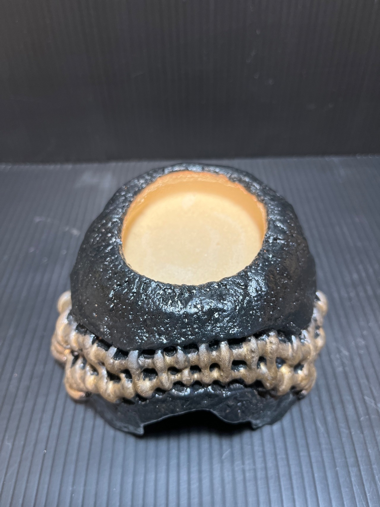 マットブラック釉とブロンズ釉で本焼したウェットシェルターです。