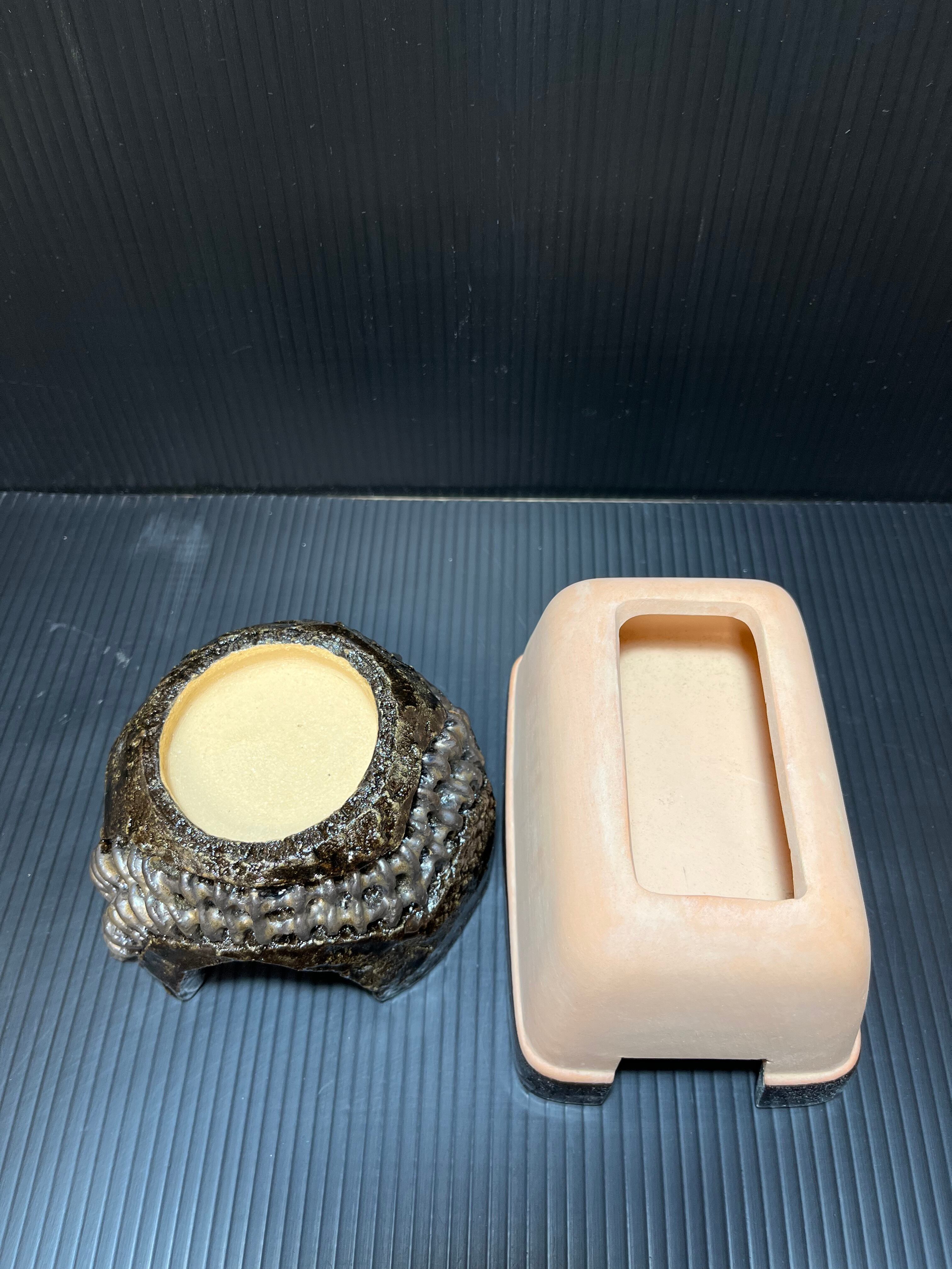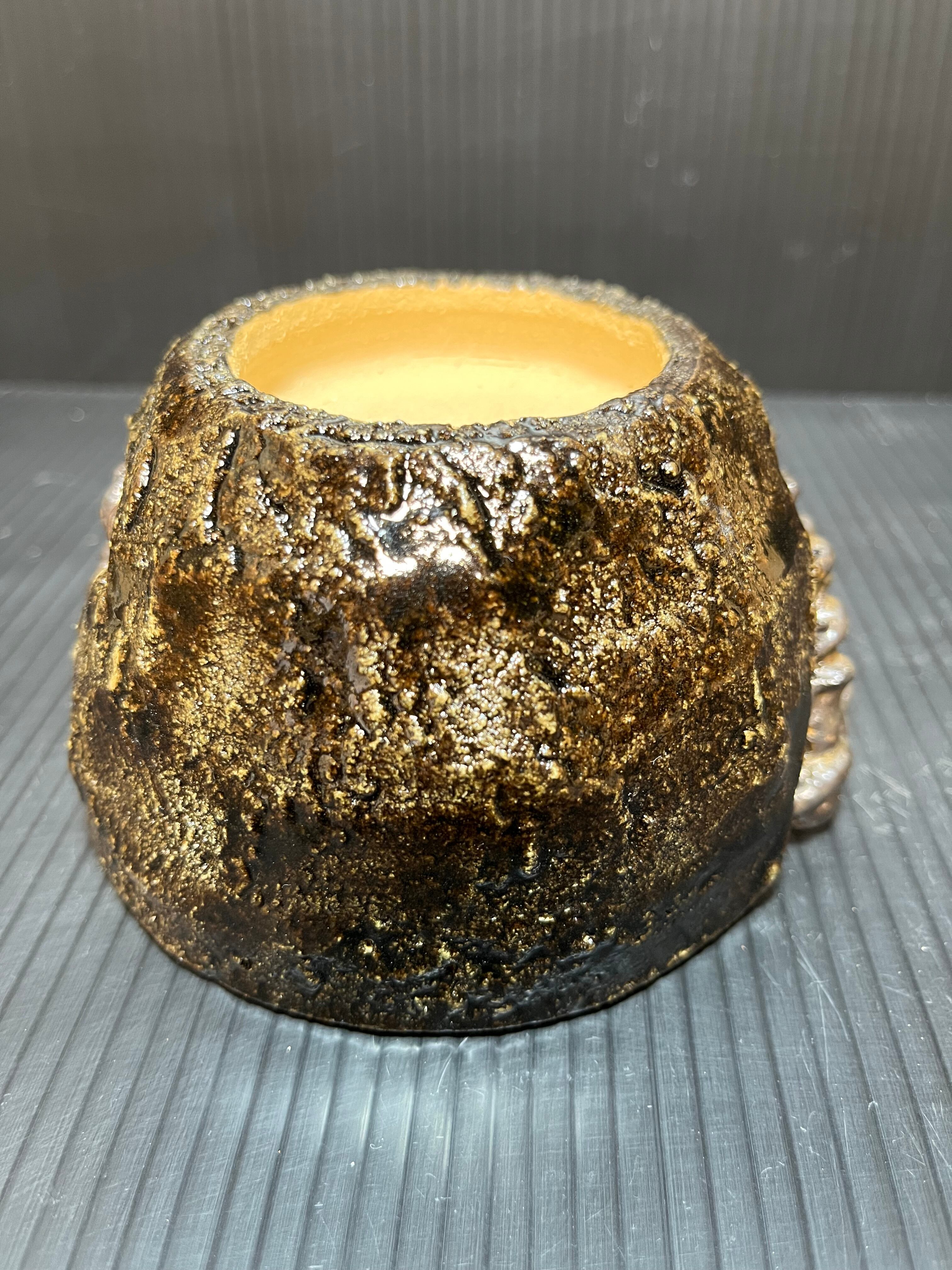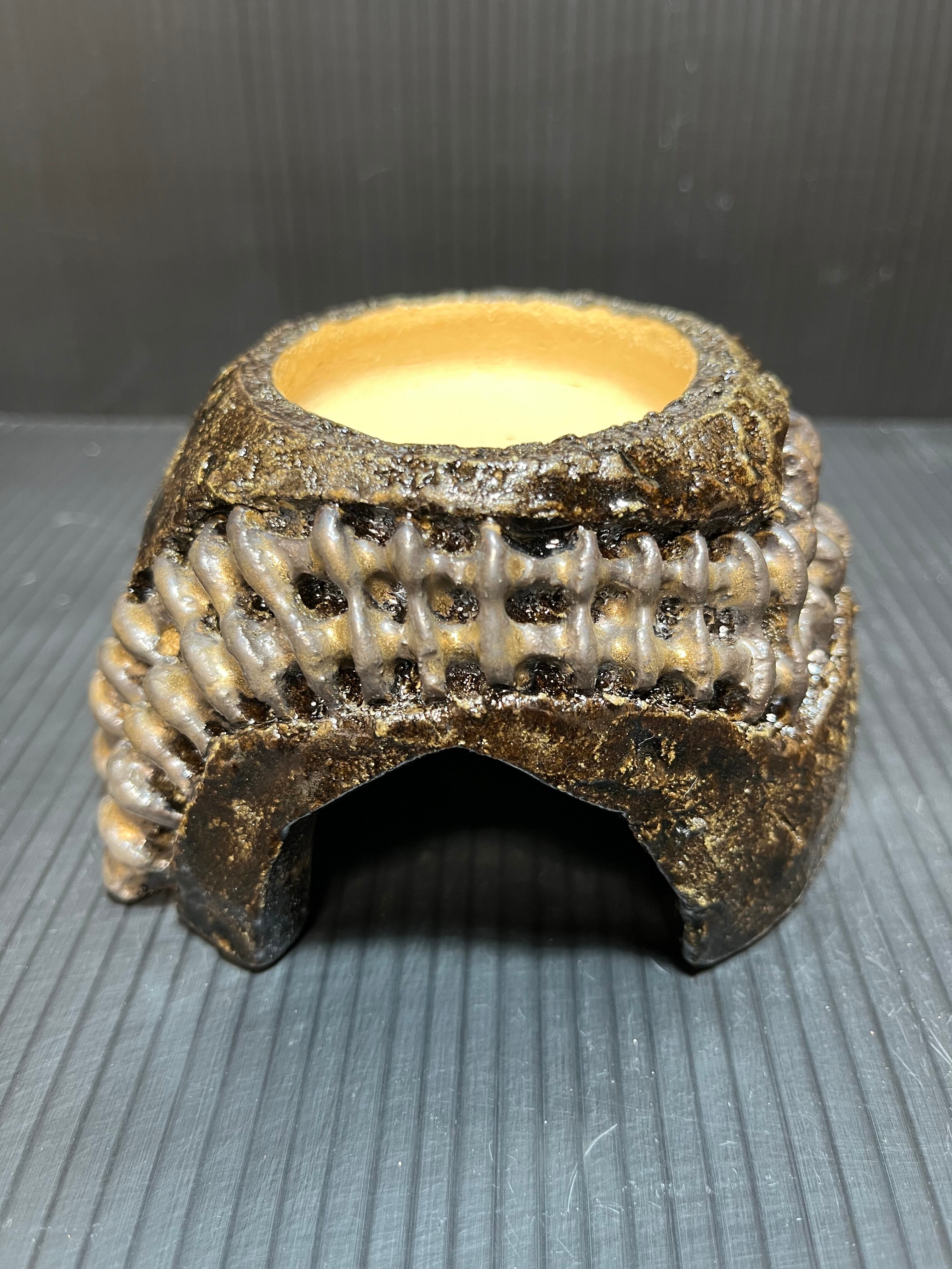 黒織部釉とブロンズ釉で本焼したウェットシェルターです。